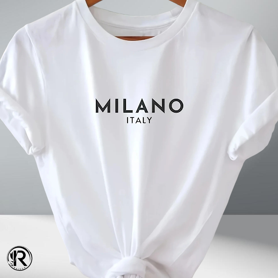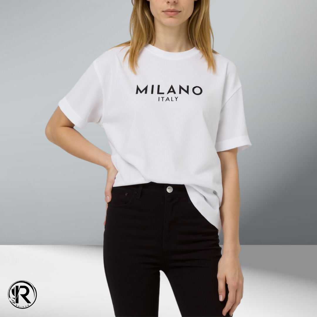 חולצת טי עם הדפס אותיות, צווארון עגול וגזרת קז'ואל קייצית. מושלמת לאביב ולקיץ – זורקת שיק בלי להתאמץ.