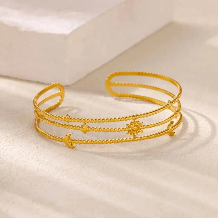 צמיד מרהיב בעיצוב בהשראת גרמי השמיים – ירח, כוכב ושמש – המשתלבים יחד למראה נשי ואלגנטי.