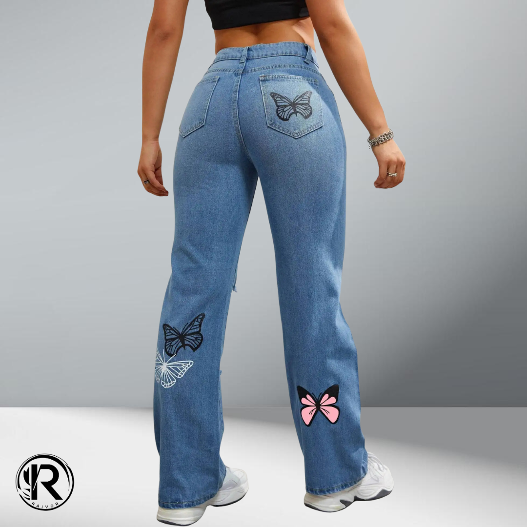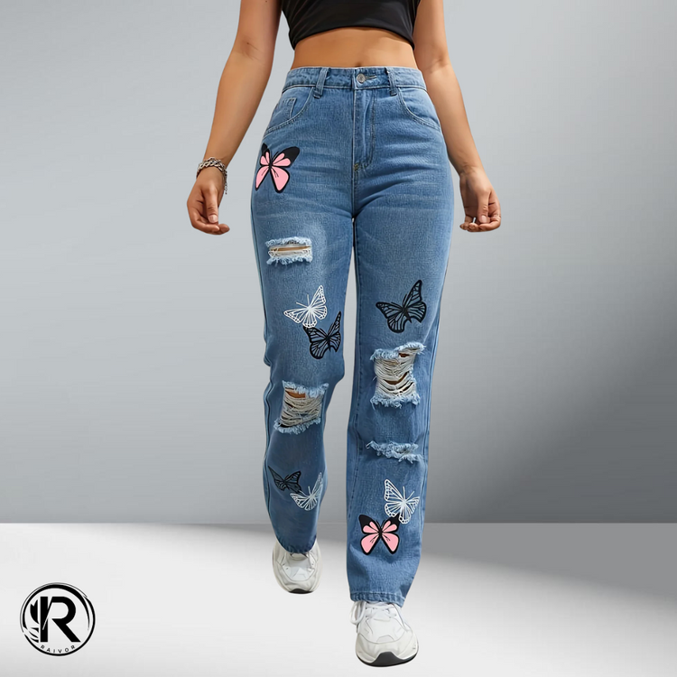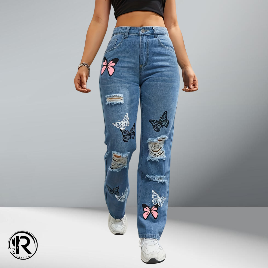 ג'ינס בגזרה ישרה עם הדפסי פרפרים וקרעים במקומות הנכונים – משלב נוחות עם לוק שלא מתאמץ אבל בולט. מושלם ליום-יום עם סטייל.