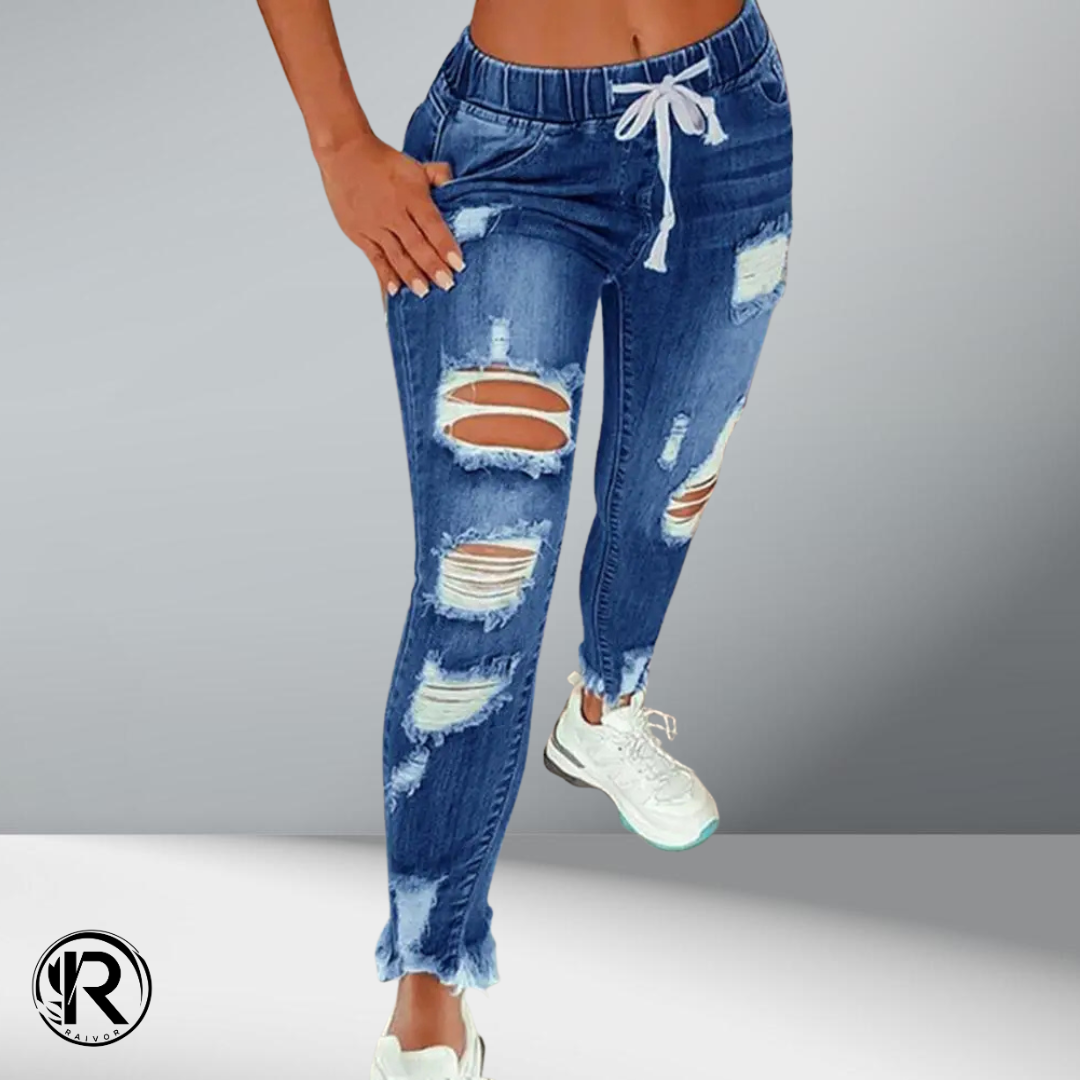 הג'ינס שיעשה לך את ההבדל – גזרה גבוהה עם מתיחה באזור המותן לנוחות מרבית, קרעים בסגנון אורבני, וגזרה שמדגישה את הגוף בצורה מחמיאה.