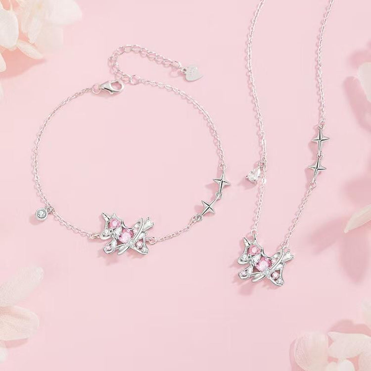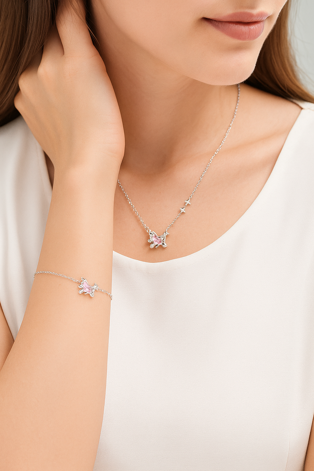 הסט כולל שרשרת וצמיד תואמים בעבודת יד מדויקת, המשובצים באבני זירקון נוצצות בגוון ורדרד עדין – לשדרוג מושלם של כל מראה, יומיומי או ערב.